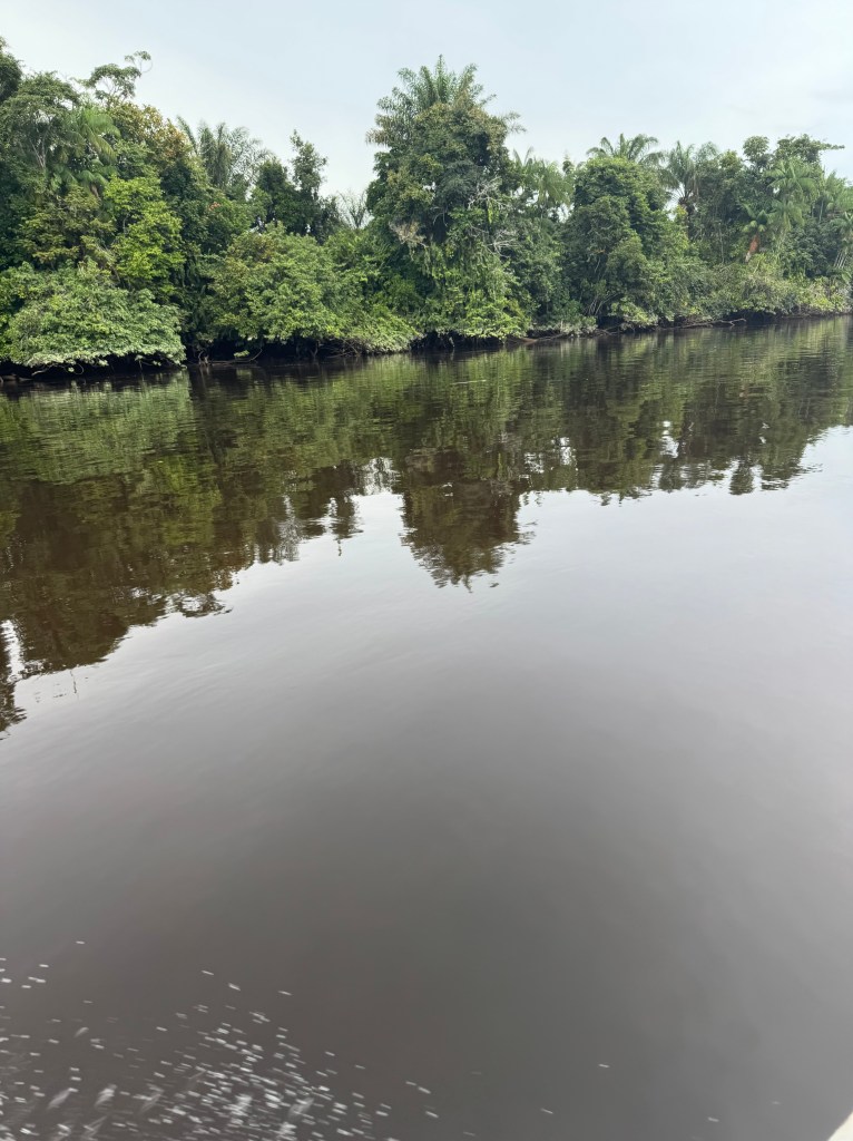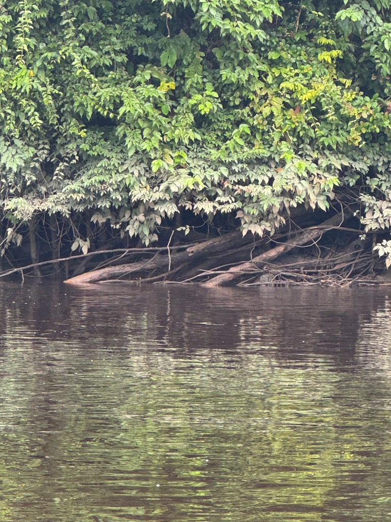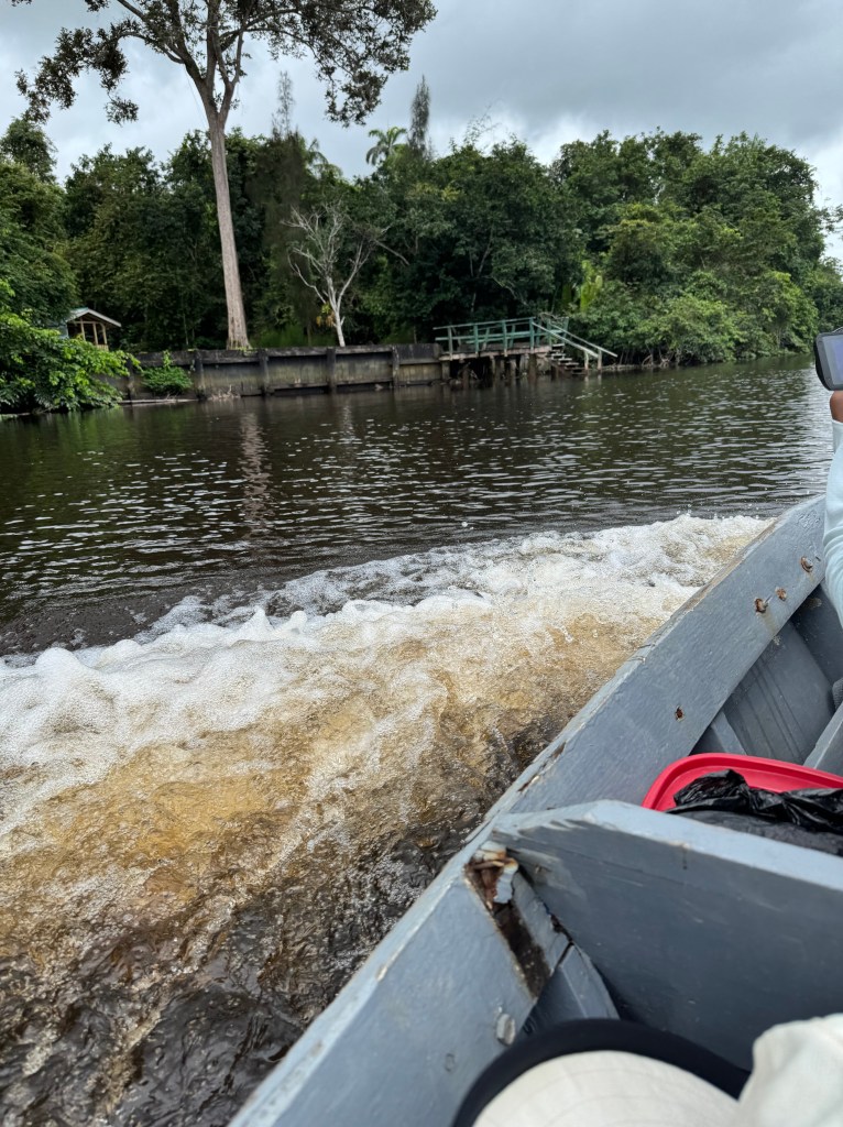 Shielded, as if in the recovery position, arms around my head which was bent towards my knees, I envisioned the Dutch tall ships under sail or rowed by enslaved oarsmen navigating these brown/red waters. Relieved to be living in another century, in another time in history albeit with its own threats, our small craft slowed and turn into a wooden jetty, its steps sunk low into the river, white bubbles and clear spray, reminiscent of coca cola poured on ice in a tall glass.